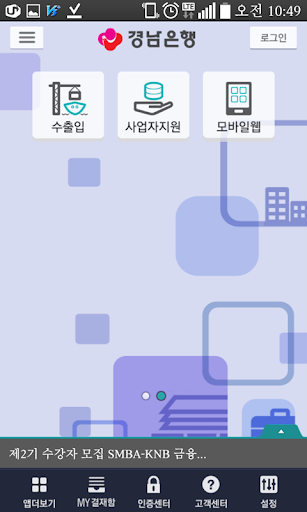 경남은행 스마트 기업 어플리케이션은 기업고객을 대상으로 스마트기기에서 실행되는 어플리케이션 입니다. 기업고객, 개인사업자가 조회, 이체, 신용카드, 전자결재, 승인/실행 등 기업고객 전용 스마트뱅킹업무를 스마트기기에서쉽게 이용할 수 있으며, 보안 프로그램과 공인인증서의 탑재로 보다 안전한 거래가 가능 합니다.