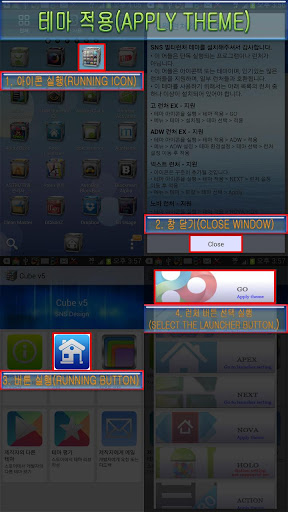 테마 아이콘을 실행 > 테마 적용 > 적용할 런처의 버튼 실행 (안드로이드 3.0 이상 전용)