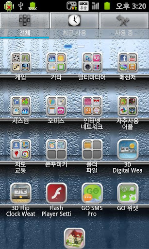 5) 어플서랍 배경 변경 : 고런처 홈화면에서 메뉴/설정/개성화설정/배경/어플 서랍 배경/GO테마 배경화면으로 들어가서 사용하고자 하는 어플서랍 배경을 선택 해 주면됩니다.