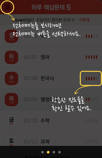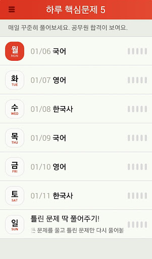 - 월~토요일에는 새로운 문제, 일요일에는 틀린 문제를 점검하는 복습문제 제공