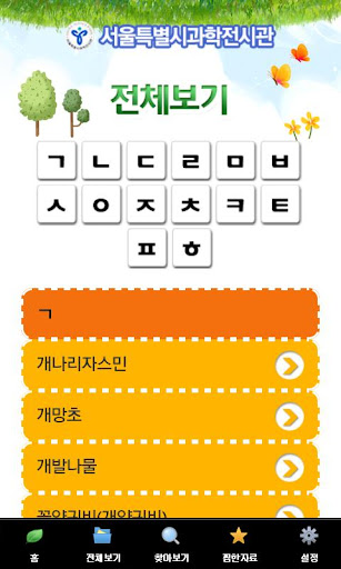- 목록보기 형태와 사진만보기 형태의 리스트와 ㄱㄴㄷ순의 전체보기 리스트를 제공