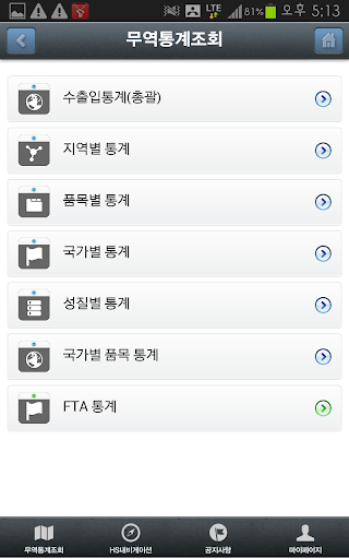 - 수출입 총괄, 지역별 통계, 품목별 통계, 국가별통계, 성질별 통계, 국가별 품목 통계 , FTA 통계