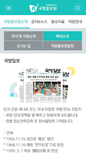 국방TV, 국방FM, 국방일보, 국방영상 등 국방홍보원의 대표 매체에 대한 정보를 원하신다면 PC 버전의 국방홍보원 웹사이트(http://www.dema.mil.kr/web/main.do)를 방문해 주시기 바랍니다.