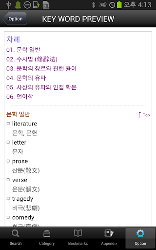영문학 영어 원서를 볼 때 나오는 수많은 영문학 용어들을 모아 사전처럼 알파벳 순서로 나열하고 그 풀이를 볼 수 있게 구성되어 있다. 영한식 뜻풀이에 영문을 혼용하여 쓰고 있어 꼬리에 꼬리를 무는 형식의 학습 호기심과 효과를 볼 수 있다. Key Word Preview인 주요 핵심 용어가 보기 좋게 정리되어 있어 활용하기 쉽다.