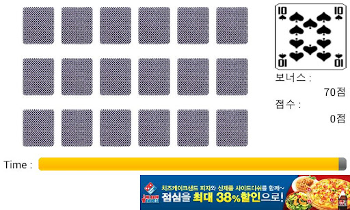 열어 봤던 카드를 기억하고 빠른 시간안에 최대한 많은 카드를 맞추는 게임으로 기억력 향상에 도움이 되는 게임 입니다.