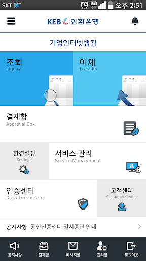 외환은행의 기업인터넷뱅킹 및 KEBiNet을 가입한 고객이 스마트폰을 통해 결재, 계좌현황조회, 이체, 실행하기를 이용하실 수 있는 기업 스마트폰 전용 어플리케이션입니다.