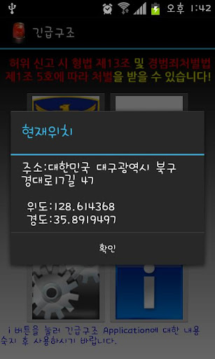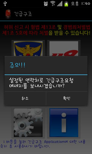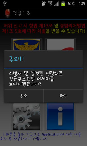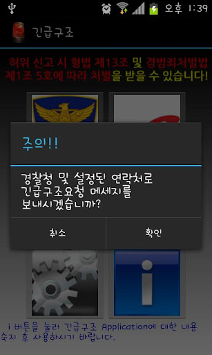1. 납치 및 감금상태 등의 상황이 발생하여 전화로 구조요청을 할 수 없는 경우 미리 저장되어 있는 경찰청(112) 및 가족의 연락처로 피해자의 현재 위치에 대한 주소와 GPS좌표를 문자메세지로 전송하여 구조에 도움이 되도록하는 목적으로 제작되었습니다.