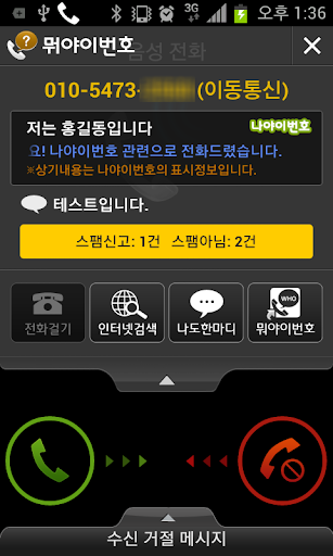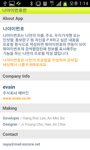 "나야이번호"는 자신이 등록한 정보를 "뭐야이번호"가 설치된 상대방의 폰에 알려주는 앱입니다.