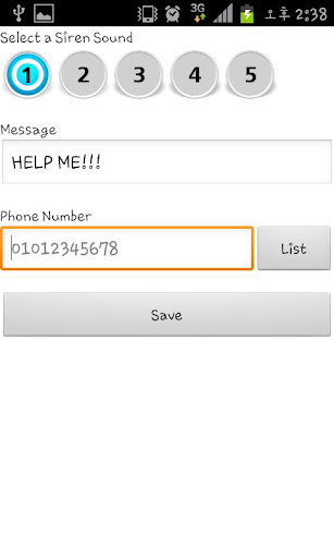 1.설정에서 싸이렌 종류, 도움요청 메세지, 전송할 번호를 설정후 저장한다.