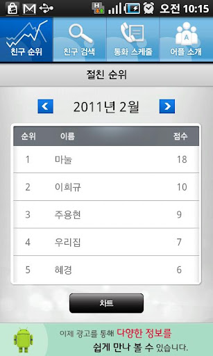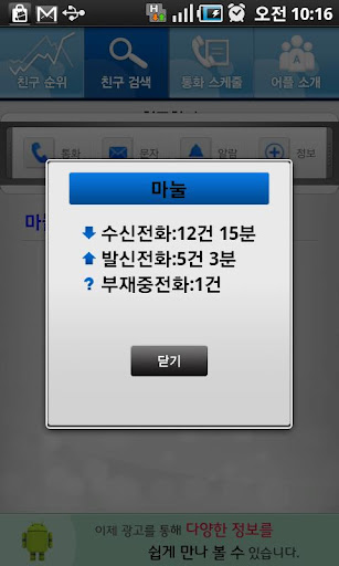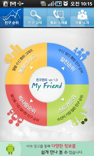My Friend 는 통화,뮨자 착발신 목록 데이터를 기초로 하여 나와 연락하는 사람들의 다양한 주제의 순위를 보여주는 어플입니다.