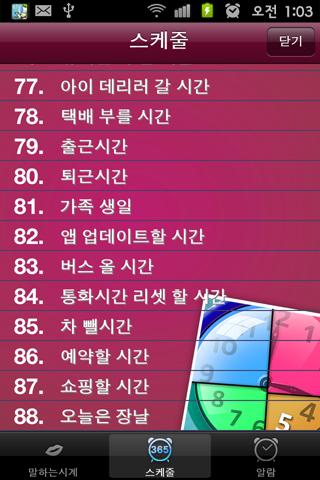 * 정각알림기능 / 모닝콜 / 유치원 차오는 시간 / 아이 데리러 갈 시간 / 애인생일 / 배우자 생일 / 친구 생일 / 아이 생일 / 상사 생일 / 어머니 생신 / 아버지 생신 / 내생일 / 결혼 기념일 / 발렌타인데이 / 화이트데이 / 빼빼로데이 / 데이트준비 / 결혼식 참석 / 약속시간 / 업무미팅 / 전화할 시간 / 부모님께 안부전화 드릴 시간 / 메/보낼 시간 / 명상할 시간 / 기도할 시간 / 교회갈 시간 / 성당갈 시간 / 절에 갈 시간 / 병원갈 시간 / 아침식사 시간 / 점심식사 시간 / 간식시간 / 저녁식사 시간 / 약먹을 시간 / 아기 우유먹이기 / 차 마실 시간 / 세탁기 돌릴 시간 / 빨래 널 시간 / 이불 널 시간 / 대청소 할 시간 / 요리할 시간 / 개밥 줄 시간 / 애완동물 밥줄 시간 / 물고기 밥 줄 시간 / 애완동물 목욕시킬 시간 / 숙제할 시간 / 공부할 시간 / 엄마오는 시간 / 게임할 시간 / 컴퓨터 할 시간 / TV볼 시간 / 취침시간 / 뜨개질 할 시간 / 광합성 할 시간 / 책 읽기 / 목욕할 시간 / 꽃에 물주기 / 운동할 시간 / 화장실 청소시간 / 장보러갈 시간 / 분리수거 할 시간 / 냉장고 청소 할 시간 / 전화벨 소리 / 기타시간 / 모닝콜(보너스) / 무음(소리없음) / 택배 부를 시간 / 출근시간 / 퇴근시간 / 가족생일 / 앱 업데이트시간 / 버스 올 시간 / 통화시간 리셋 할 시간 / 차 뺄시간 / 예약할 시간 / 쇼핑할 시간 / 오늘은 장날