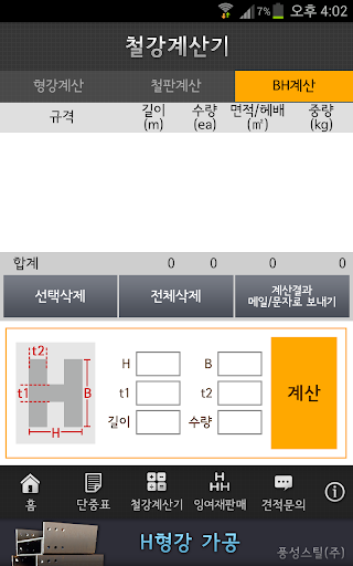 철강계산기 메뉴에서는 각종 형강제품의 중량과 면적을 빠르게 구할 수 있으며, 철판 소부재와 빌탑빔(Builtup H-Beam)의 중량과 면적도 같이 구하실 수 있으며, 모든 계산결과는 핸드폰 문자메세지나, 이 메일로 전송이 가능 합니다.