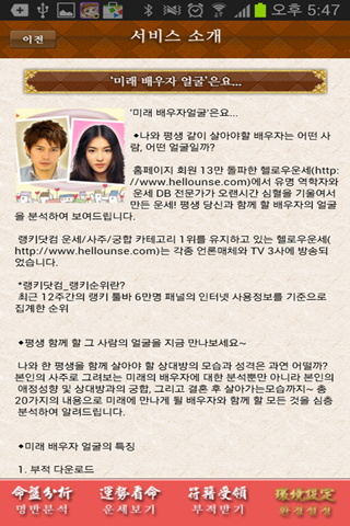 포털사이트 다음과 네이트에 운세정보를 제공하고 있는 헬로우운세(http://www.hellounse.com)는 각종 언론매체와 TV 3사에 방송되었습니다.