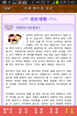 미래에 만나게 될 배우자와 어떤 모습으로 살아갈지 알려드립니다. 결혼 후 전체적인 가정의 분위기와 두사람의 결정체인 아이를 언제쯤 만날 수 있는지 궁금증을 풀어드립니다.