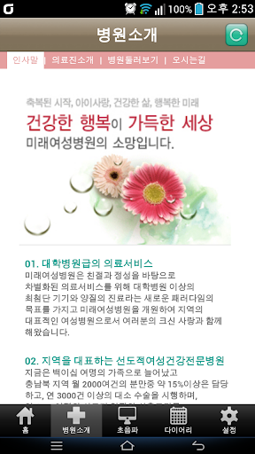 축복된 시작, 아이사랑, 건강한 삶, 행복한 미래를 약속하는 미래여성병원이 스마트폰 어플리케이션으로 산모 여러분들께 한걸음 다가갑니다.