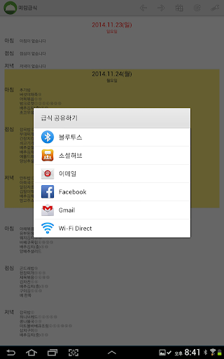 본교의 급식이 궁금한 타인에게 급식 메뉴 공유를 하는 것이 가능하며 타인에게 전송하는 것뿐만 아니라 블루투스 전송, 이메일 전송, 페이스북 공유가 가능합니다.