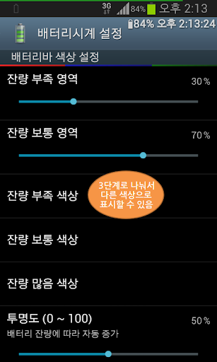 - 배터리 잔량에 따라 3단계로 색상이 변함(단계 영역, 색상 설정 가능)