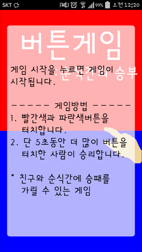 빨간버튼과 파란버튼으로 2P로 사용할 수 있습니다. 누가 더 많이 터치하는지에 따라 승부가 갈리게 됩니다. 5초라는 시간제한 속에서 버튼을 더 많이 터치하는 사람이 승리 5초만에 승부를 가르는 초간단 게임 입니다.