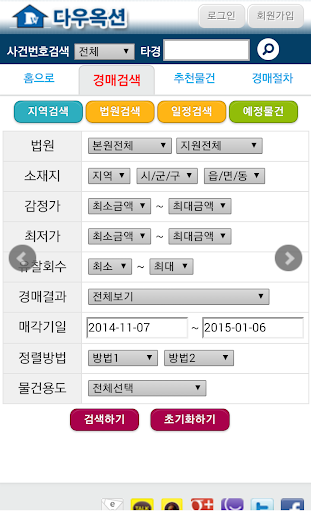 구성은 경매검색, 추천물건, 경매절차로 구성되어 있으며, 경매검색에서는 지역검색, 법원검색, 일정검색, 예정물건으로 검색할 수 있도록 되어 있습니다. 또한 경매물건설명 에는 기본내용, 상세내용, 기일내용, 권리분석, 통계(인근낙찰물건)으로 구성되어 본 물건을 보다 자세히 검토 하실수 있을 것입니다.