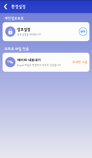 - 데이터 Excel로 내보내기, 암호설정, 배경화면 선택 가능