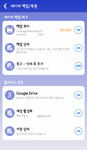 - 자동 데이터 SDCARD 백업/복구, Cloud 백업 가능(Google Drive에 자동으로 저장)
