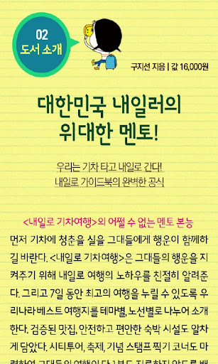 먼저 기차에 청춘을 실을 그대들에게 행운이 함께하길 바란다. 은 그대들의 행운을 지켜주기 위해 내일로 여행의 노하우를 친절히 알려준다. 그리고 7일 동안 최고의 여행을 누릴 수 있도록 우리나라 베스트 여행지를 테마별, 노선별로 나누어 소개한다. 검증된 맛집, 안전하고 편안한 숙박 시설도 알차게 담았다. 시티투어, 축제, 기념 스탬프 찍기 코너도 마련하여 그대들의 여행이 단 1분도 지루하지 않도록 배려했다. 내일러라면 을 동반자로! 지금까지의 내일로 가이드북은 모두 ‘어제로’ 보내자.