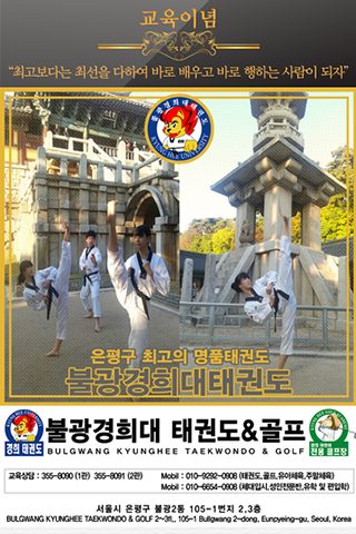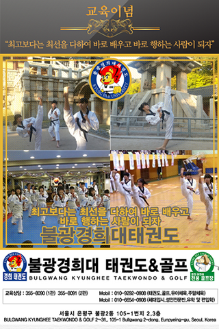 단지 태권도 기본이 틀이 되어 태권도의 우수성을 발굴하고 연구하며, 수련하는 무도적인 태권도의 기본이 되는 체육관을 지켜나가고 싶을 뿐입니다. 불광경희태권도장의 관훈 정신은 "최고보다는 최선을 다하여 바로 배우고 바로 행하는 사람이 되자!" 입니다. 태권도에 대한 열정으로 땀 흘리는데 게을리 하지 않는 결과는 바로 올바른 정신과 건강한 심신단련을 위해 자기 자신의 성공의 밑거름이 되어줄 영양분을 제공하여 만들어지는 기본이 되는 체계적인 미래지향적 교육과 도전적인 모허을 자신감으로 일궈내 학교 및 사회생활에에서도 우수한 인재를 양성 배출하는 불광경희태권도장이 되리라 제 자신과의 굳은 의지로 약속하고 되뇌이며, 이곳 은평구 지금은 은평뉴타운으로 불리우는 불광동지역 및 진관동 지역에 16년전 뿌리를 내려 벌써 많은 국가대표 배출과 다양한 우수한 인재들을 양성하여 배출하였습니다.
