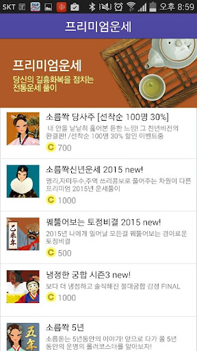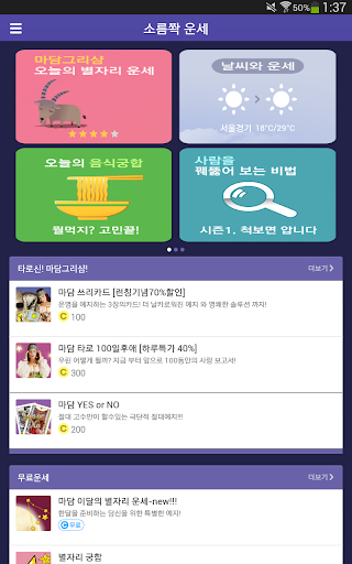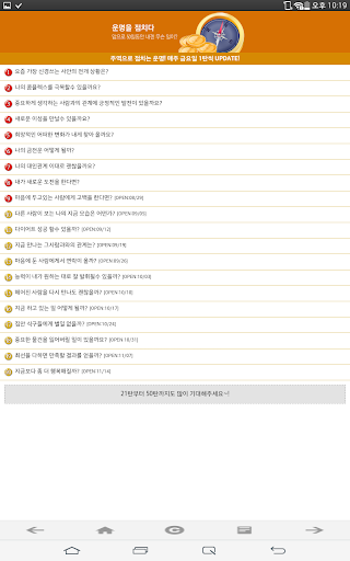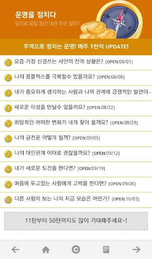 특집운세 시리즈 운명을 점치다 앞으로50일[매주금요일 1탄씩오픈 총 50탄],특집 운세 시리즈 사람을 꿰뚫어보는 비법 시즌 1[매주 화요일 1탄씩 오픈 총 30탄],오늘의 별자리 운세,오늘의날씨와 운세,소름쫙알람[오늘의 운세+날씨+알람] , 주간 대인관계 운세 연산기, 앞으로30일 타로,앞으로 7일 타로, 태어난 요일로보는 운세, 주말 운세 happy weekend, 혈액형 궁합보기,엽기동물점 성격 운세, 직업 운세, 금전 운세, 건강운세, 엽기동물점 궁합 ,이상형찾기 운세, 복권당첨 운세, 행운의여행지 운세 국내편,행운의여행지 운세 해외편,
