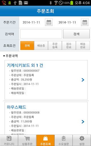 상품주문, 주문조회 , 수요설문, 공지사항 기능
