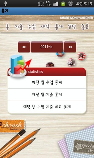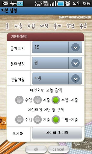1) 메인화면,수입, 지출, 상세내역, 통계, 설정 등 총 6개의 메뉴로 구성