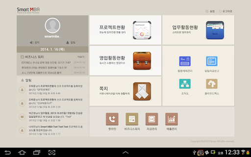 Smart MBA는 기업 구성원간에 업무활동을 공유하고 취합하여 업무의 흐름을 한눈에 파악하고 관리할 수 있는 협업시스템입니다. UC(Unified Communication)가 기본 탑재되어 구성원간에 적시성 있는 의사소통이 가능하며, 더존ERP를 사용하는 기업의 경우 매출관리, 자금관리 등 기업 성과의 기본이 되는 지표를 연동 및 분석하여 관련자들이 효과적으로 기업을 운영할 수 있도록 지원하고 있습니다.