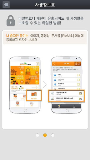 사생활이 노출되는 갤러리, 메일, 다이어리, 가계부 등은 ‘APP보호’에 등록하고, 혼자만 즐기는 이미지, 동영상은 ‘File보호’ 에 등록하여 사생활 안전하게 보호!