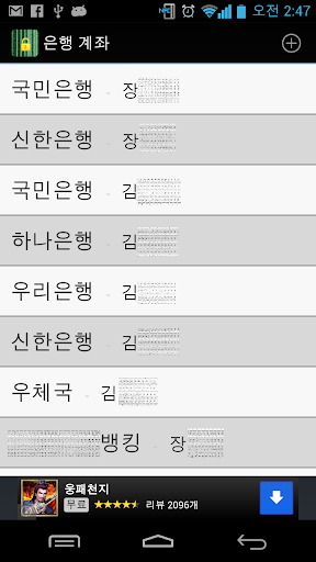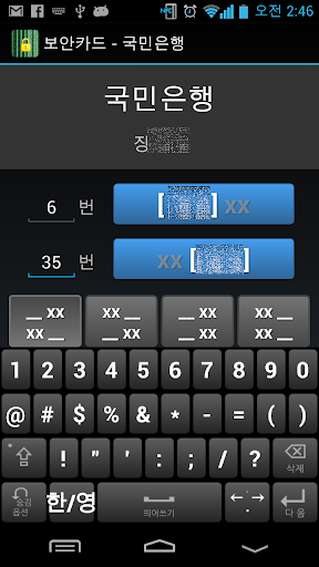 보안카드 번호는 화면에 최대한 보이지 않도록 했으며, 은행에 따라 요구하는 번호의 형태가 다른 점을 반영하여 필요시 버튼을 눌러 언제라도 원하는 형태의 번호를 볼 수 있도록 했습니다.