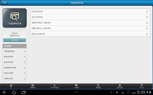 ○ 이용내역조회 - 이용내역조회, 승인이용내역조회, 후불하이패스이용내역, 후불교통카드이용내역, 항공권발권내역