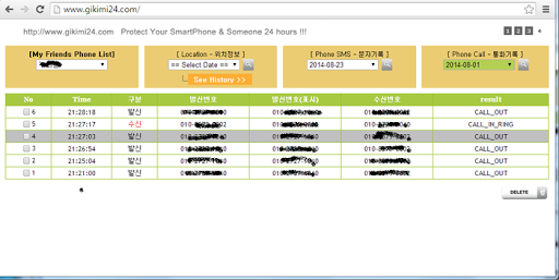 7. 제공하는 관리자 페이지에서 나의 실시간 위치정보 및 과거 위치정보, SMS, 통화기록등을 관리하실 수 있습니다.