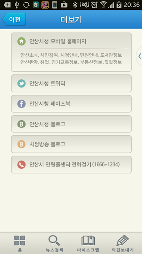 - 안산시청 모바일 홈페이지 연동 서비스(민원안내, 시민참여, 안산관광, 도서관정보, 취업정보, 교통정보 등)