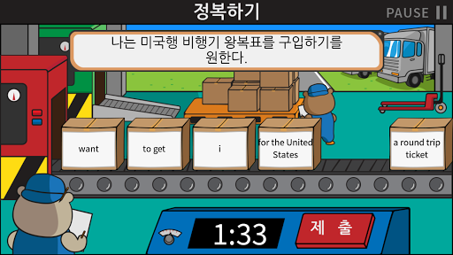 '정복하기'에서는 지금까지 '학습하기'와 '연습하기'에서 숙달한 문장을 무작위 순서로 제시됩니다. 드래그 앤 드롭 액션을 통해 무작위로 배치된 문장을 올바른 순서로 맞추면 됩니다.