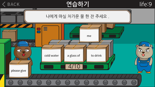 '학습하기'와 '연습하기'는 간단한 터치 액션만으로 한국어를 영어로 영작문 학습을 할 수 있습니다.