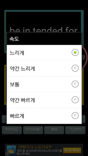 ▶ 속도조절 : 화면에 표시되는 숙어의 속도를 느리게부터 빠르게까지 총 5단계의 속도로 조절할 수 있습니다.