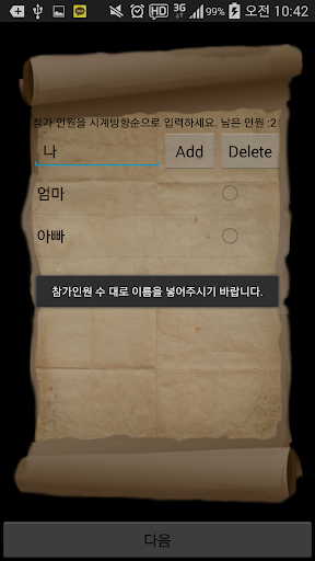 핸드폰이 사회자역활을 대신하기 때문에 사회자 없이 플레이가 가능합니다.