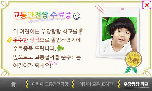 ※어플리케이션 내 수료증은 ㈜비앤디에서 어린이의 놀이를 위해 자체 제작한 수료증이며 공공기관에서 발급하는 어린이 교통안전 수료증과는 차이가 있음을 알려드립니다.
