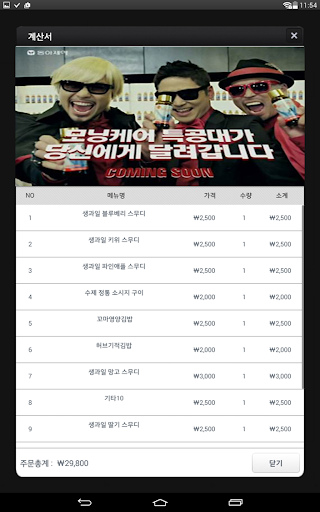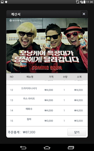 3) 계산서 화면 : 뭘 먹었고, 얼마나 먹었는지 계산서에서 확인할 수 있습니다.