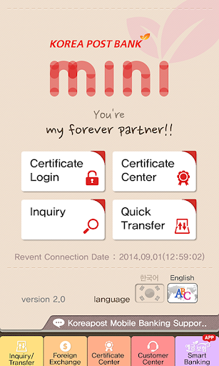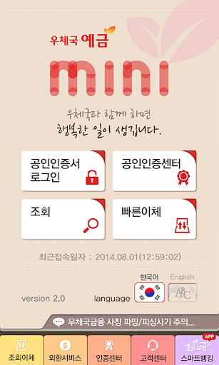 우체국 간편이체 서비스인 "우체국 미니앱"이 새롭게 단장하여 서비스를 시작합니다. "우체국 미니앱" 서비스는 계좌조회, 이체 등 은행 업무의 기본 기능에 충실하여 뱅킹 사용자가 빠르고 쉽게 기본적인 은행 업무를 처리할 수 있도록 고안되어 만들어진 특화서비스 입니다. 또한 외국인 이용편의를 위해 전체 메뉴에 대해 영어로 서비스를 제공하고 있습니다. 이동통신사와 인터넷이 연결된 곳이라면 언제 어디서나 신속하고 편리하게 사용하실 수 있으며, 본 서비스의 모든 거래 정보는 공인인증서 사용으로 보다 안전하게 은행 업무를 이용할 수 있도록 암호화 처리된 모바일 뱅킹 서비스를 제공합니다. 보안적으로 취약한 해킹폰의 경우 서비스가 불가합니다.
