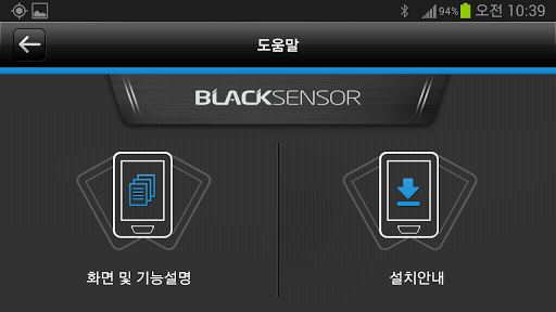 9. 도움말: 블랙센서 앱의 버튼 별 기능 소개와 스마트폰 설치안내를 제공합니다. 설치안내를 통하여 차선인식 기능의 정확도를 높일 수 있습니다.