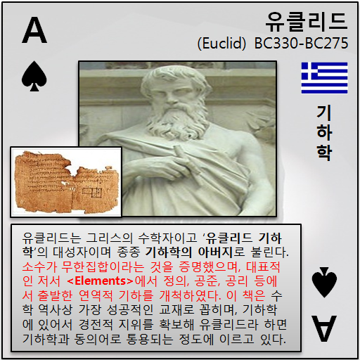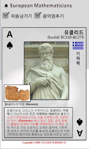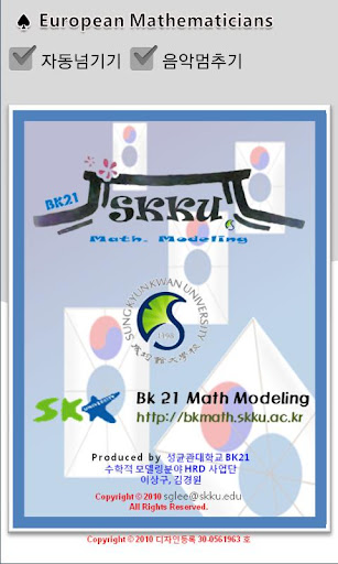 성균관대학교 수학과 BK21사업 수학적모델링 분야 핵심인재양성사업단에서 디자인 등록한 수학자카드 포스터 중 유럽의 수학자들을 스마트폰에서 학습할 수 있도록 한 교수학습자료로써 유럽의 수학자들에 대해 알 수 있도록 만든 카드형식의 어플리케이션입니다.