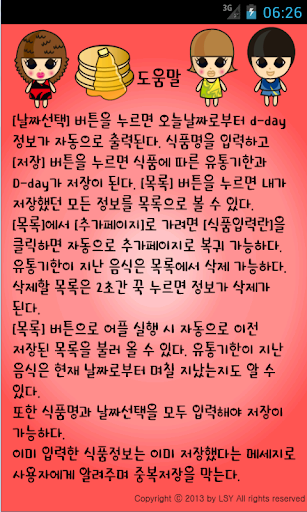 '유통기한 D-day' 어플리케이션은 식품명과 유통기한 날짜를 입력해 현재 날짜에 대한 D-day를 자동으로 출력하고 목록을 만들어 식품에 대한 유통기한 d-day를 관리 할 수 있습니다.
