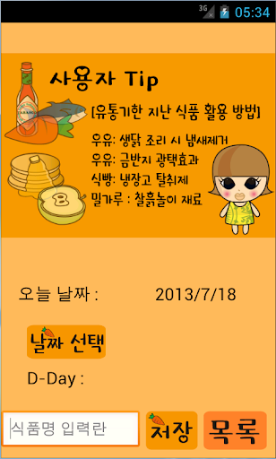 '날짜선택' 버튼을 누르면 오늘날짜로부터 d-day정보가 자동으로 출력됩니다. 식품명을 입력하고 '저장' 버튼을 누르면 식품에 따른 유통기한과 D-day가 저장됩니다.