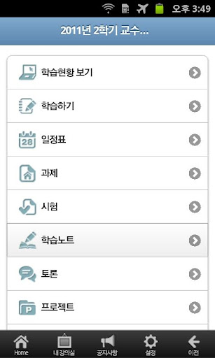 eCampus와 동일한 수강과목을 모바일을 통해 연속적으로 학습할 수 있으며 eCampus 내의 강의듣기 및 공지사항, 쪽지 등 다양한 학습활동을 모바일에서 이용할 수 있습니다.