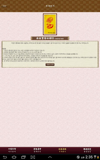 가정의 행복을 위해 사용하는 가정번영기원부(家庭繁榮祈願符)는 한 해 동안 어려운 일들이 생기지 않게 하고 가족의 일들이 잘 풀리게 해 주는 부적입니다.부적을 다운받으신 후 휴대폰 배경화면 또는 인쇄하셔서 몸에 지니고 다니시면 효과를 보실 수 있습니다.