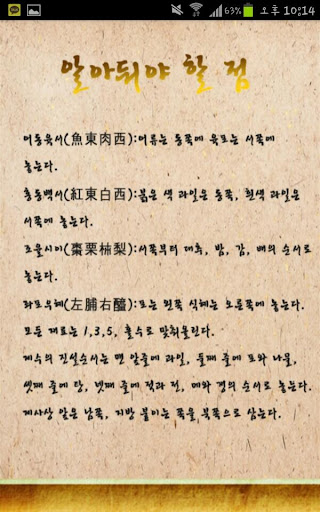 이 어플은 제사상과 차례상을 차리는데 도움을 주는 어플로써, 상차림은 물론 지방쓰는것 까지 도움을 주는 어플입니다 ~